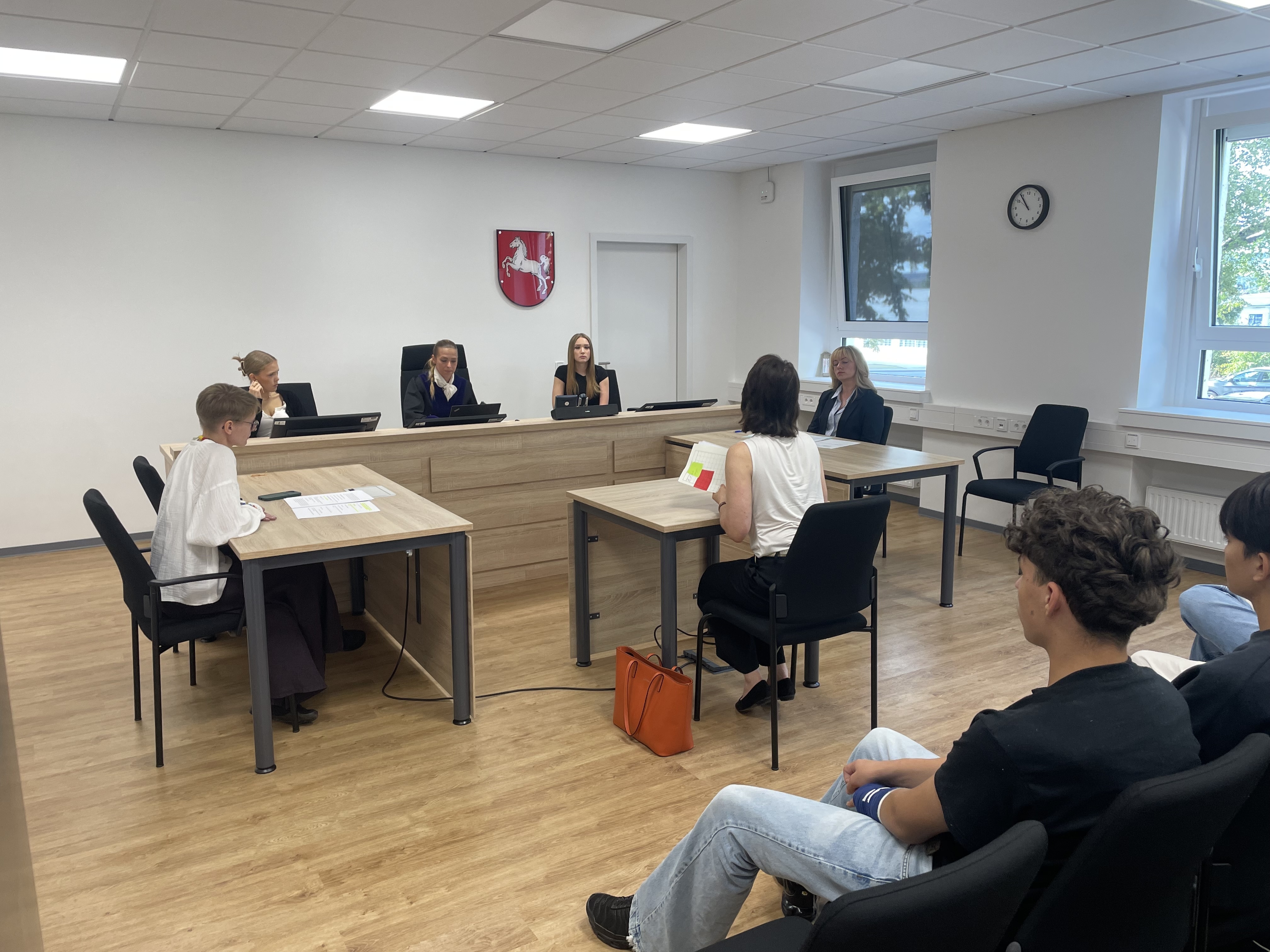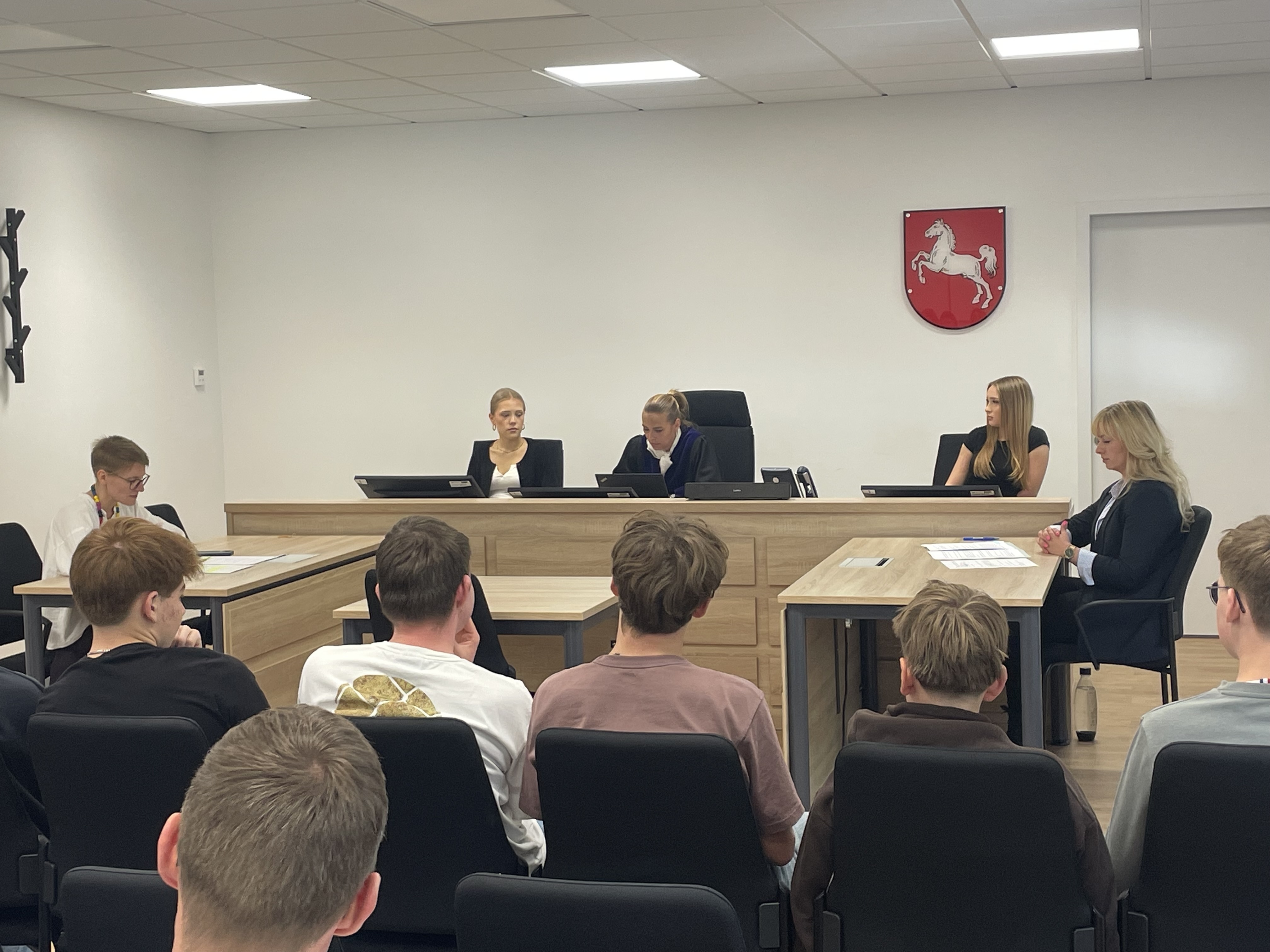 Während die mit einer Berufsrichterin und zwei Schülerinnen, die die Funktion der ehrenamtlichen Richter einnahmen, besetzte Kammer der Klage stattgab, stimmten die Schülerinnen und Schüler, die im Zuschauerbereich der Verhandlung folgten, in einer geheimen Abstimmung im Anschluss an die mündliche Verhandlung anders ab. Die Mehrheit war für eine Klageabweisung. Hieran entspann sich im Anschluss eine lebhafte Diskussion. Die Schülerinnen und Schüler interessierten sich insbesondere für die verschiedenen am Sozialgericht Hildesheim tätigen Berufsfelder und erhielten einen Einblick in den beruflichen Werdegang und den Berufsalltag der Richterschaft und Rechtspflege.