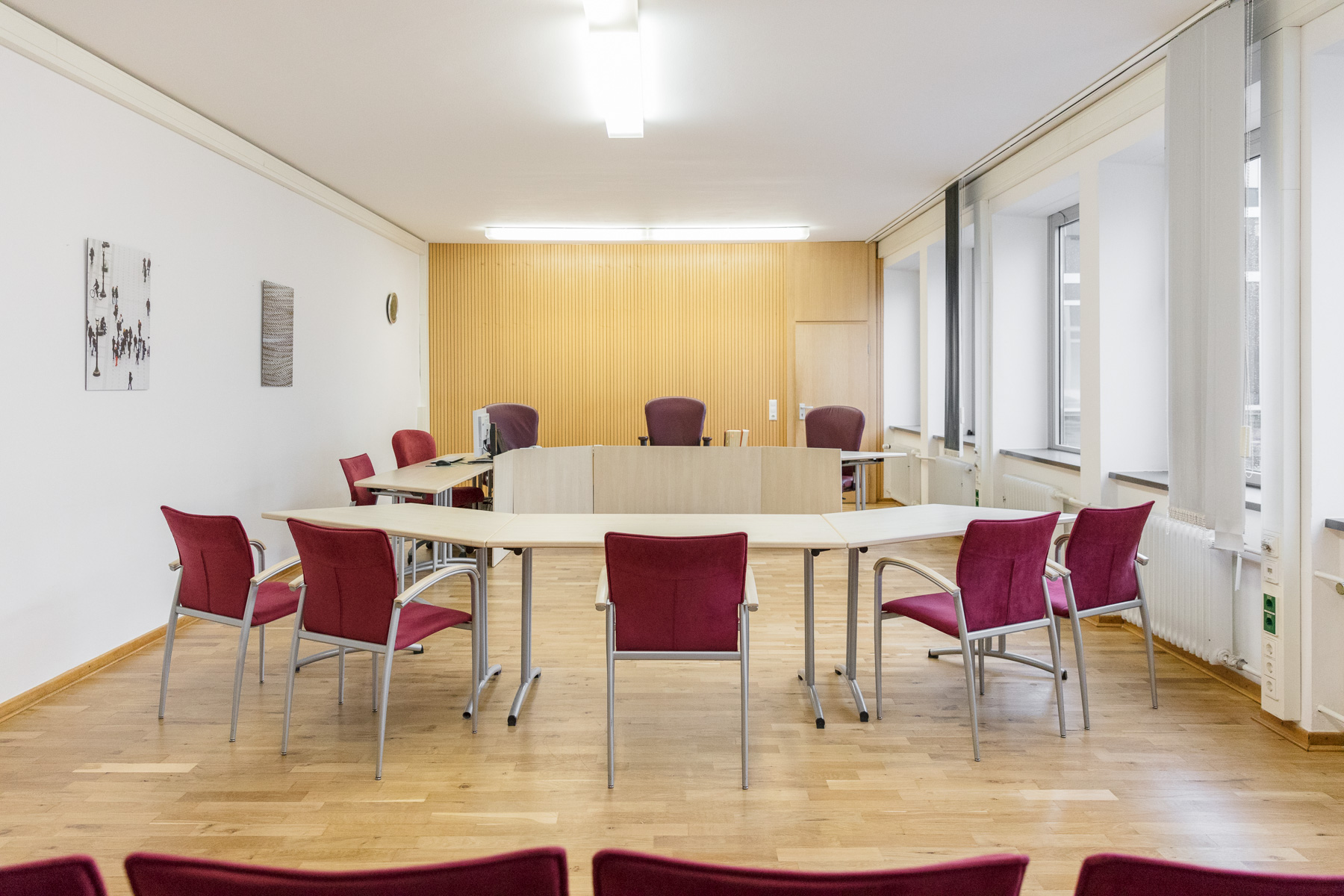 Die mündlichen Verhandlungen fanden nicht nur in Hildesheim, sondern auch in Göttingen und Northeim statt. In Göttingen standen Gasträume im Hotel zur Eisenbahn (Groner Landstraße 9) zur Verfügung, doch schon ab dem 1.10.1954 konnten Räume (Sitzungssaal, Wartezimmer und Arztzimmer) im Haus der Verbindung Winfridia angemietet werden (Nikolausberger Weg 17). Der Mitvertrag kam durch Vermittlung des Amtsgerichtsdirektors Henze zustande, der dieser Verbindung angehörte. Das Präsidium stimmte in seiner Sitzung am 1.9.1954 diesem neuen Sitzungsort zu, obwohl der Vermieter einen Heizzuschlag in Höhe von 10,- DM monatlich in den Wintermonaten forderte, die in der Gaststätte „Zur Eisenbahn“ nicht zu zahlen waren. Die Heizung und der Heizzuschlag waren in der Folgezeit häufiges Diskussionsthema mit dem Vermieter, der ab Dezember 1955 wegen gestiegener Kokspreise eine Erhöhung des Heizzuschlages auf 50,- DM durchsetzten konnte. Die Beheizung der Räume verbesserte sich dadurch jedoch nur teilweise, denn das überalterte Heizungssystem war den Anforderungen nicht mehr gewachsen. So kam es weiterhin zu Rücktrittsdrohungen von Sozialrichtern und der Weigerung von Ärzten, im kalten Arztzimmer Untersuchungen durchzuführen. in dieser Situation war für die Beteiligten besonders unerfreulich, daß sie sich während der Beratung des Gerichts auf dem Flur aufhalten mußten. Das Sozialgericht wurde, bedingt durch das studentische Umfeld, auch Opfer eines Studentenstreichs: am 26.2.1960 wurde zwischen 12.00 Uhr und 13.00 Uhr das aushängende Metallschild mit der Aufschrift „Sozialgericht Hildesheim“ entwendet. Trotz Nachforschungen des Hausmeisterehepaares als „verdeckte Ermittler“ blieb das Schild verschwunden. Die Anzeige bei der Polizei mit dem Antrag, polizeiliche Ermittlungen durchzuführen, wurde fast postwendend von der Staatsanwaltschaft Göttingen dahingehend beschieden, daß das Verfahren eingestellt worden sei, da der Täter nicht habe ermittelt werden können. Ab März 1961 konnte endlich diese letztlich für Sitzungszwecke ungeeigneten Räume aufgegeben werden, weil nunmehr Sitzungssäle im Landgericht zur Verfügung standen. Und nach Fertigstellung des Amt- und Arbeitsgerichts als Anbau zum Landgericht Göttingen fanden (und finden) die Sitzungen des Sozialgerichts Hildesheim fast ausschließlich im Sitzungssaal des Arbeitsgerichts statt.